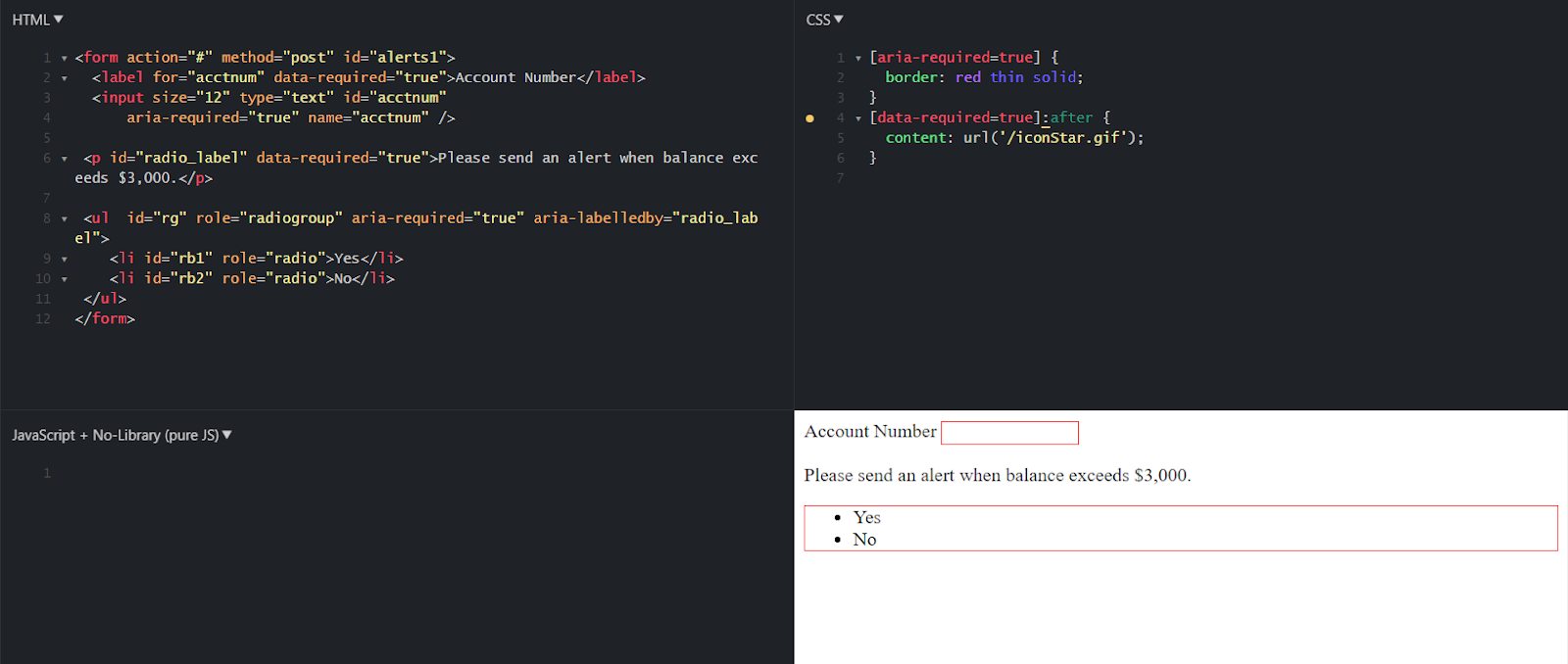 Esta técnica proporciona una indicación programática de que un campo de formulario que se muestra a través de la presentación como obligatorio, es obligatorio para el envío exitoso de un formulario.